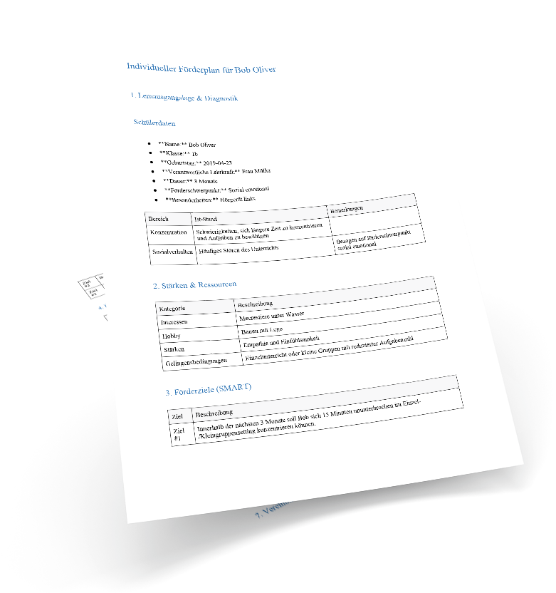 💡 Der KI-Förderplan-Assistent hilft Ihnen, individuelle Förderpläne professionell und zeitsparend für jedes Kind passgenau zugeschnitten zu erstellen. Mit passenden Formulierungen, Förderzielen und Beobachtungshilfen.